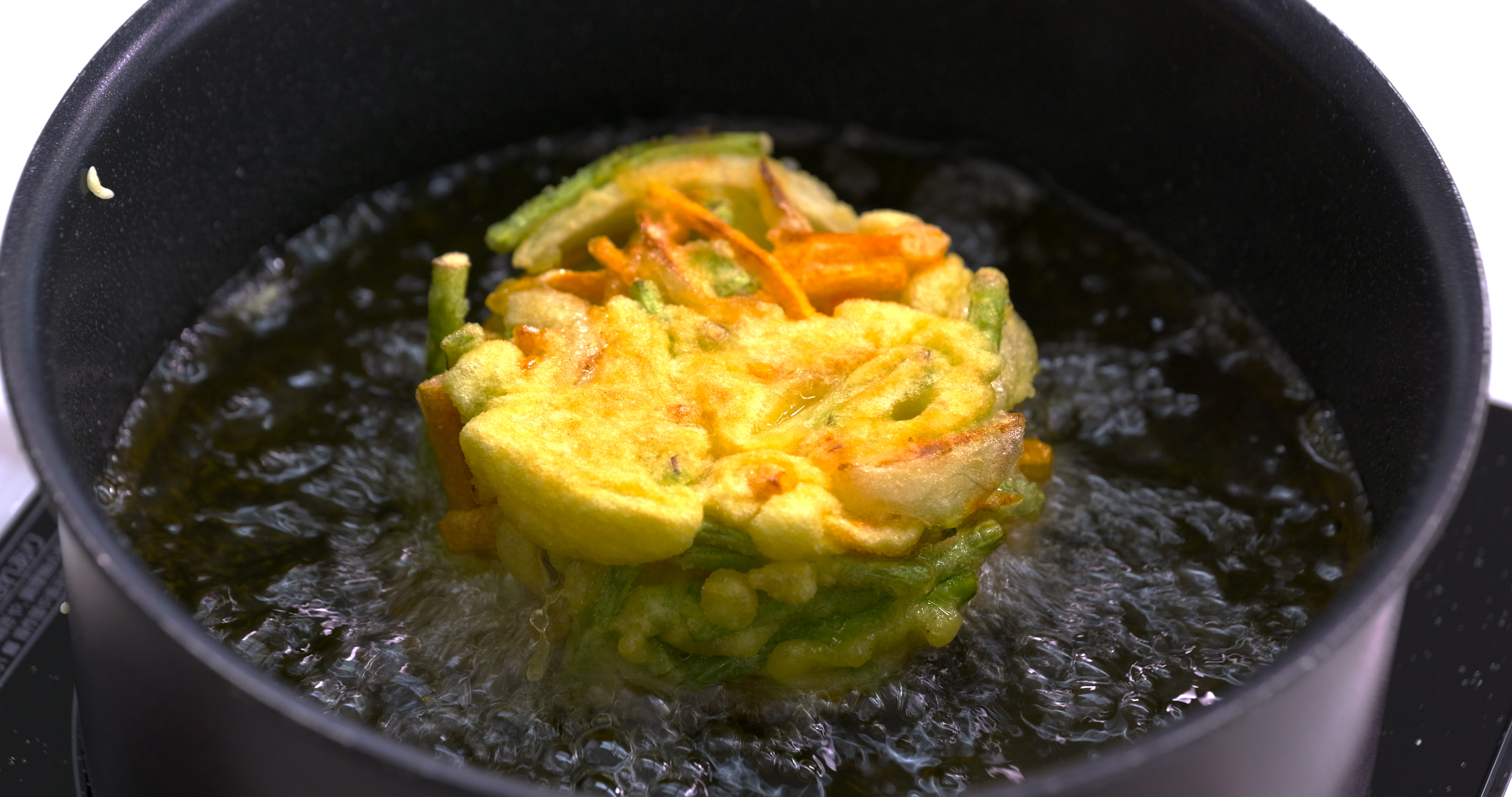 ⑤かき揚げリングから外し、裏返してきつね色になるまで揚げる。